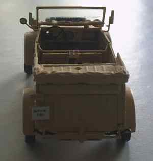 The vehicle had a light but robust construction. The rear mounted, air-cooled engine had four cylinders, a displacement of 985 ccm and an output of 23.5 hp. Its maximum speed was about 80 km/h. The gearbox had four forward and one backward gears. About 51,000 Kübelwagens were produced until the end of WW2. The vehicle was used by every unit, from Africa to Russia.