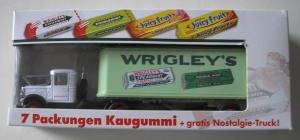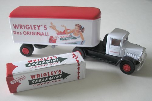 Seven packages of chewing gum and one nostalgical truck for free. Many companies offer their products together with a model car for a special price. Here you can see two historic Wrigley’s trucks.